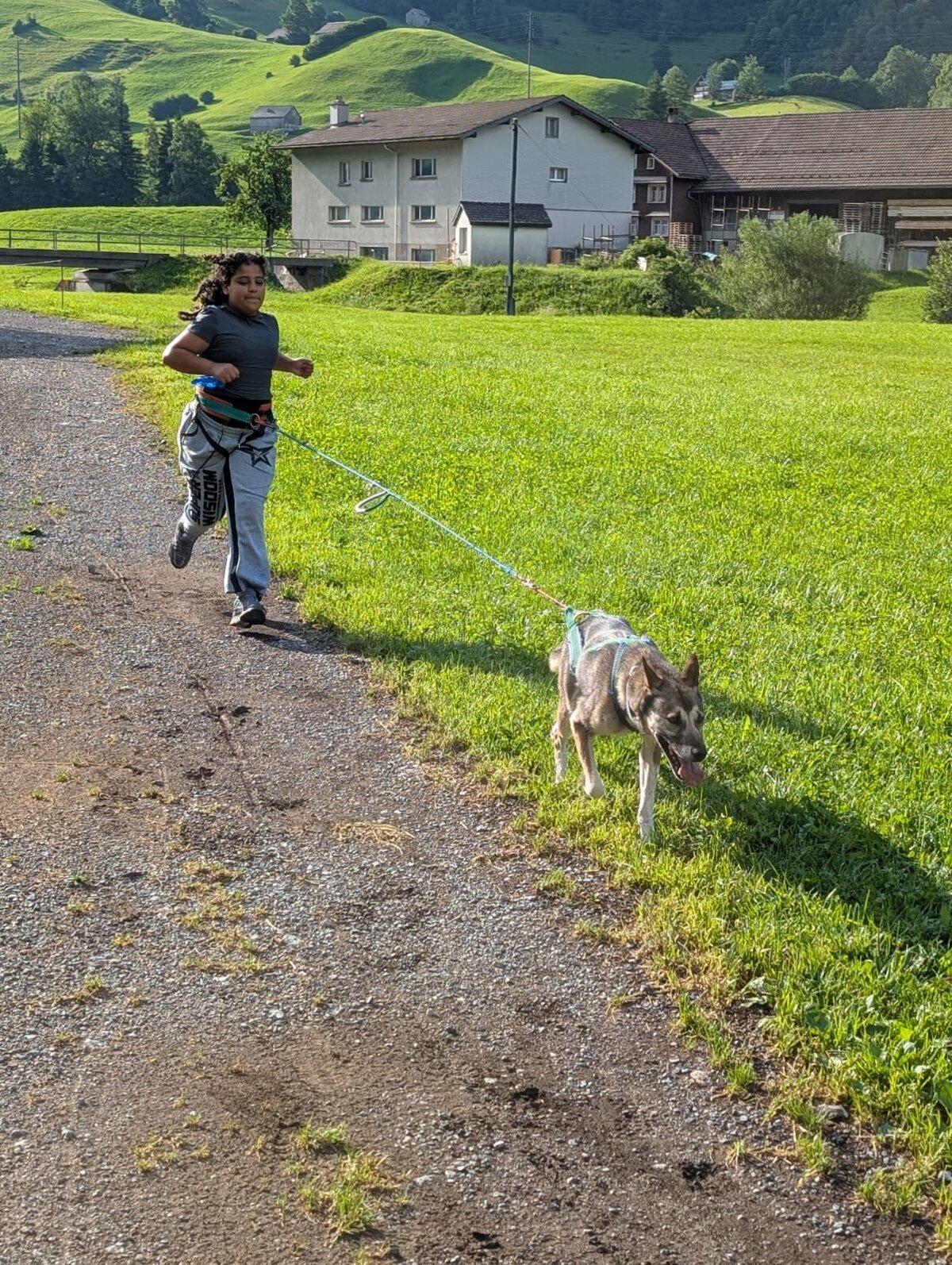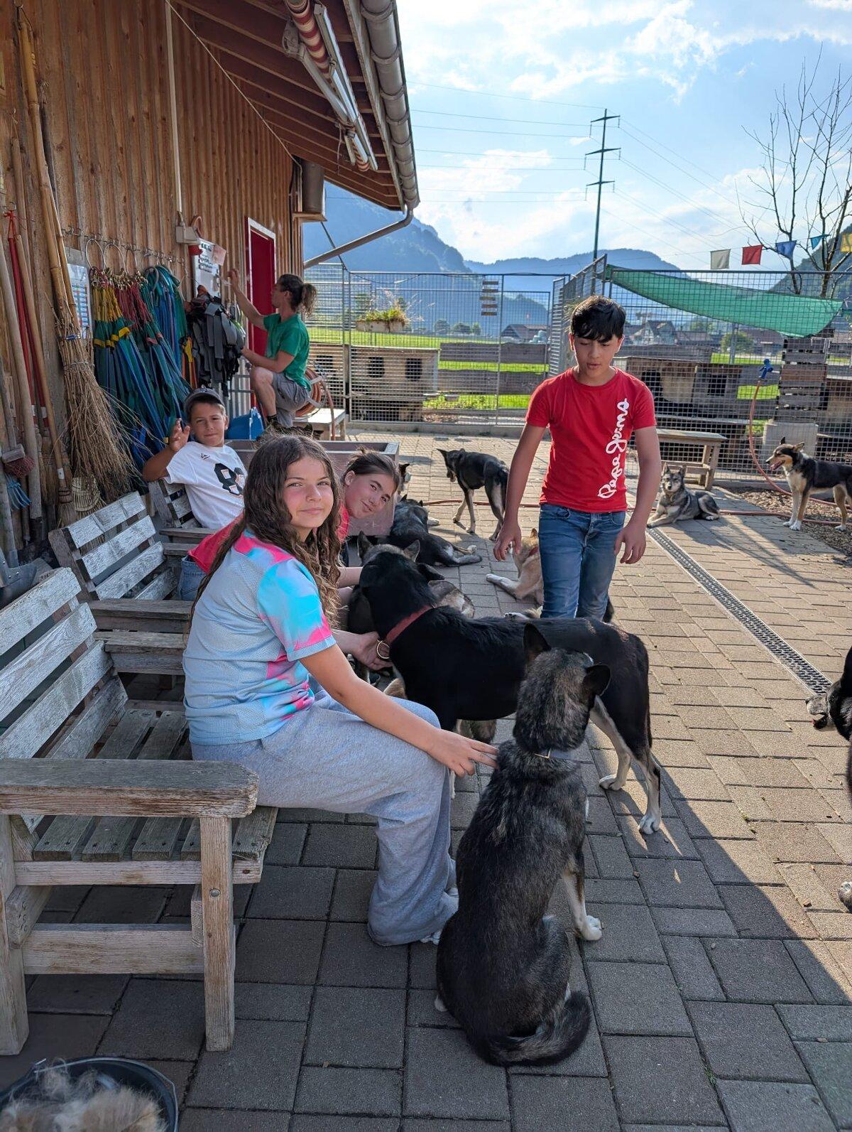 Am Morgen haben wir uns in Zweiergruppen eingeteilt. Jede Gruppe durfte sich einen Hund aussuchen – oder besser gesagt: Der Hund hat sich seine Gruppe ausgesucht! Nachdem alle Hunde verteilt waren, bekamen sie ihre speziellen „Gstältli“ und wir zogen Klettergurte an.
