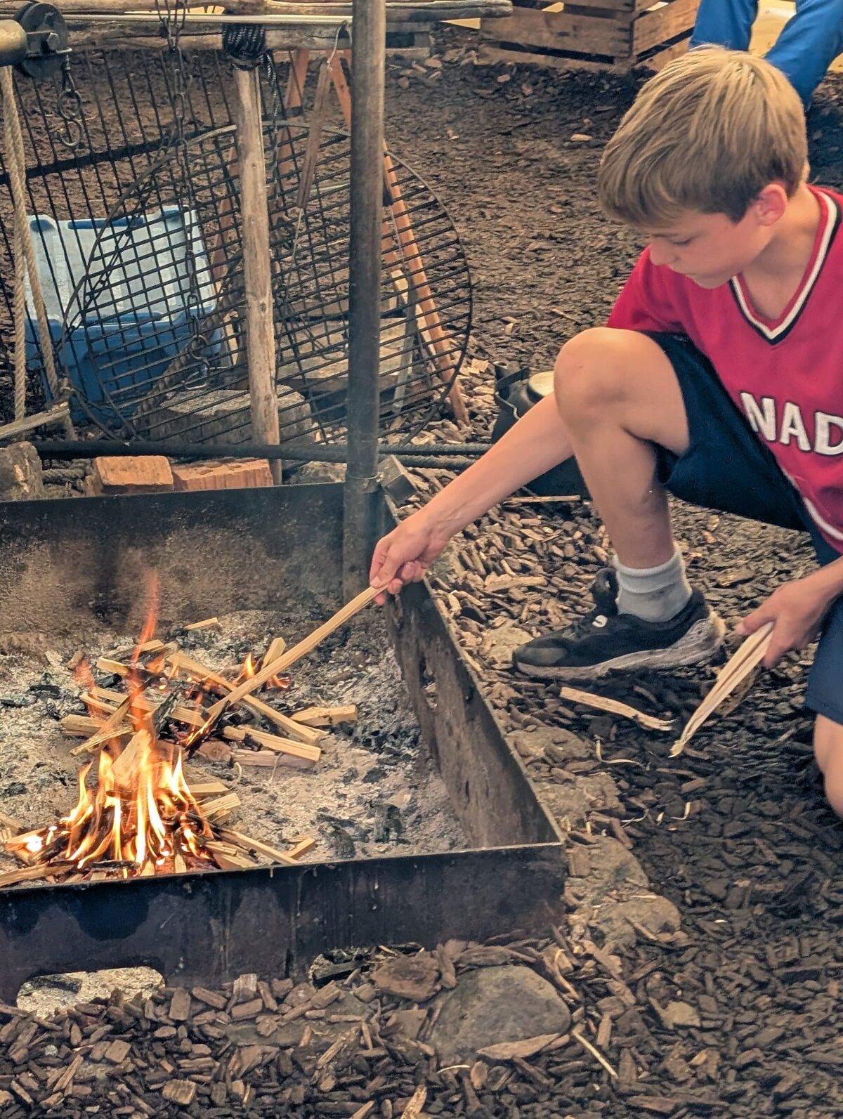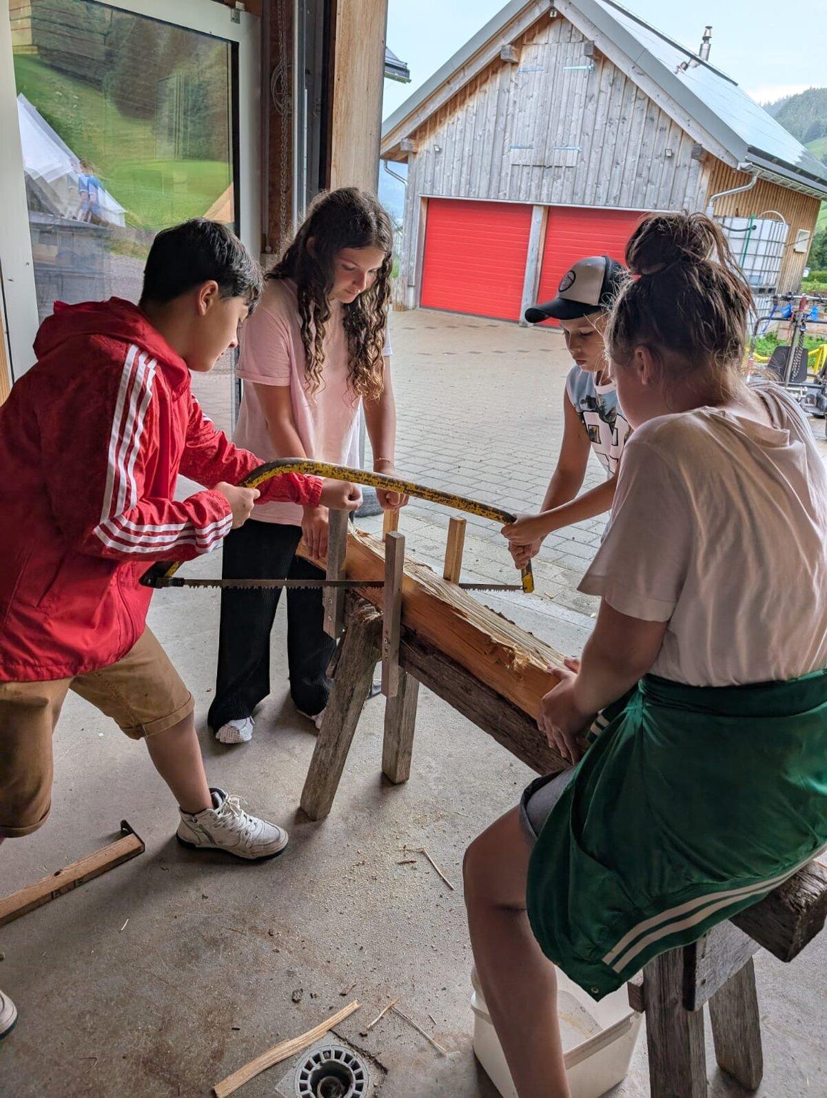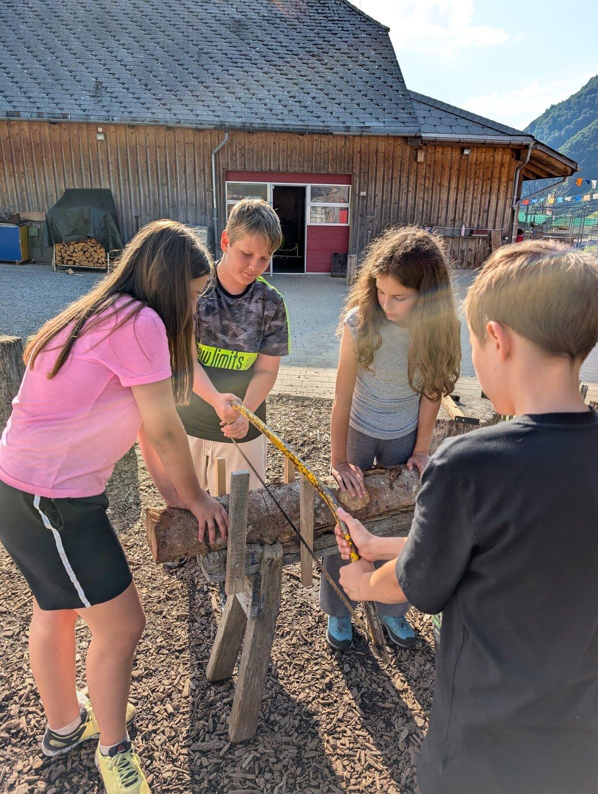 Zuerst mussten wir grosse Holzstücke in 30 cm lange Teile sägen. Danach ging es ans Spalten – und zwar mit einem Hammer, nicht mit einer Axt! Die kleineren Stücke, die wir so nicht spalten konnten, zerkleinerten wir mit einem Manueller-Holzspalter. Alles kam in eine grosse Box und wurde später zum Koch-Tipi gebracht.